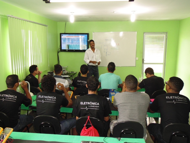 AS AULAS SÃO FEITAS EM LABORATÓRIO DE ELETRÔNICA UTILIZANDO A METODOLOGIA DE APLICAÇÃO DA TEORIA NA PRÁTICA.